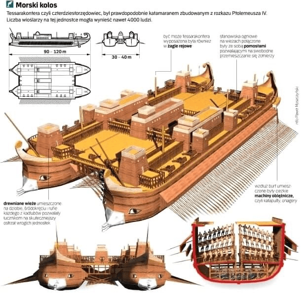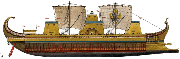 The Ptolemaic dynasty of Egypt had the strongest big ship tradition. The fleet of Ptolemy II Philadelphius and Ptolemy IV Philopator were known to be vast and unique, with Ptolemy IV building a gargantuan tessarakonteres or “forty-rowed”, and Ptolemy II’s fleet consisting of 336 warships. In Plutarch’s, “Life of Demetrius” he described this massive ship and touched on its true purpose.