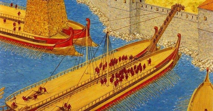 Earlier in the Hellenistic wars between the Diocochi naval battles were characterized by ramming and missile fire. For example, in the battles between Demetrius and Ptolemy ships as large as “sixes” were utilized to frontally ram Ptolemy’s ships on his right wing. Also, these large ships could have been used to smash through lines of smaller ships, sheer off oars, and use their height advantage to throw missiles down on the ships adjacent to them, as described by Diodorus. Finally, Philo the Byzantine advises not to engage in boarding unless absolutely necessary. The most valuable sailors according to Philo are ones who are willing to take on more of a defensive posture to fight off boarding attempts and “resist the urge to board”, while their ship can reposition itself to ram. Superior oarsmen and missile superiority paired with disciplined defenders take the day in Philo’s opinion as well as in historical instances of battles.